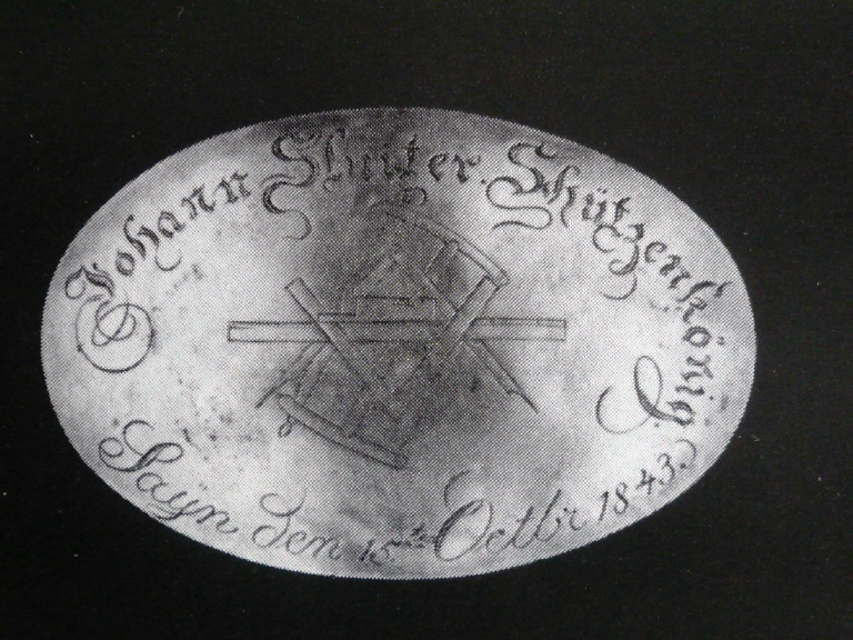 Sayn, 16. October 1843. Die Feier des Geburtstages Sr. Majestät (Friedrich Wilhelm IV.) unseres Königs wurde von der sich dahier neuerdings gebildeten Schützengesellschaft auf folgende Weise, der hohen Bedeutung des für Preußen wichtigen Tages, gefeiert. Nachdem der dem Tage angemesse Gottesdienst unter Absingen des feierlichen „Te Deum“ beendigt war, versammelte sich die Schützengesellschaft im Hause des Schützenvaters Herrn Merz II. Hand in Hand bildeten die Schützen einen Kreis um ihren Vorsteher und dieser trug die für die Gesellschaft bestimmten Verhaltensregeln vor, wo bei den Worten: Urkundlich unter dem gegebenen Handschlag, jeder dem Vorsteher Herrn Cappallo die Hand reichte, zum Zeichen, seinen Anordnungen als Vorsteher Folge zu leisten. Von hier aus ging es unter Begleitung einer gut besetzten Musik zum Schießplatz, woselbst ein Vogelschießen stattfand. Nicht volle 2 Stunden dauerte es, so war der Preis erreicht. Der Schluß des Tages wurde durch einen gesellschaftlichen Ball, in dem prachtvoll dekorierten Lokale des Schützenvaters beschlossen“.