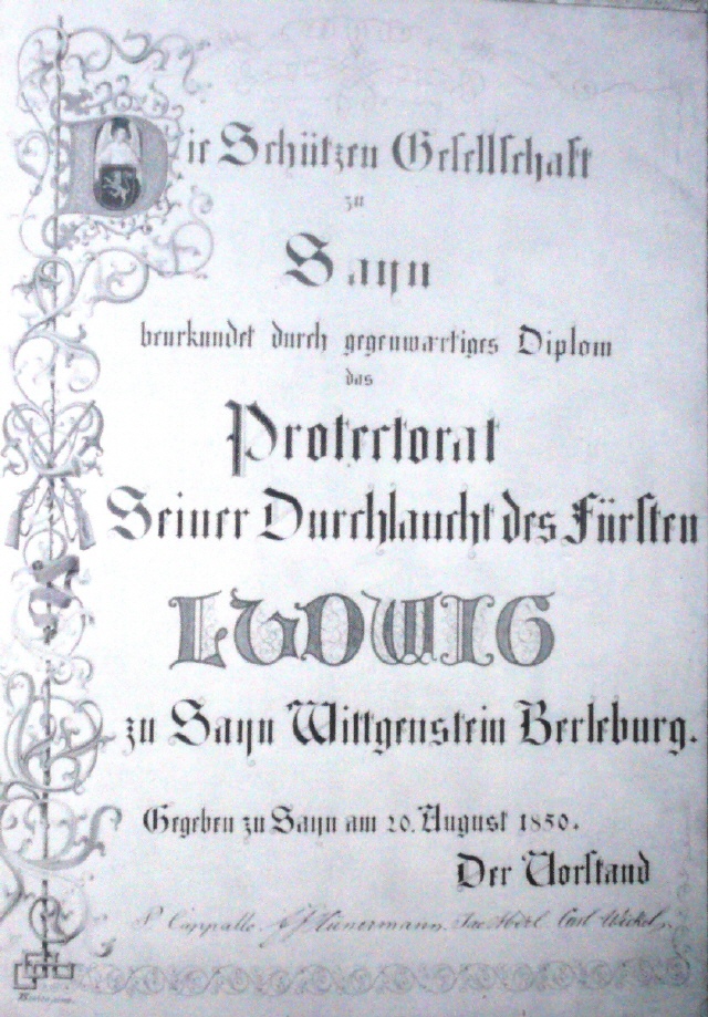 Gesellschaften suchten auf ihrem Weg einen Schutzherren, dem sie sich anschließen und unterstellen konnten. Die Schützengesellschaft Sayn trug bereits wenige Jahre nach ihrer Gründung dem nach Sayn zurückgekehrten Fürsten Ludwig-Adolf-Friedrich zu Sayn-Wittgenstein-Berleburg die Unterschutzstellung der Gesellschaft an. Vertraglich beurkundet und vereinbart wurde dies am 20. August 1850.