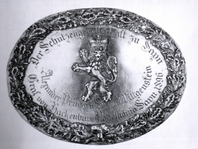 Beim Schützenfest im Jahre 1896 wurde der Graf von Hachenburg Schützenkönig und stiftete satzungsgemäß „ein Schild aus edlem Metall“, welches auf die Schärpe (die erste Königskette wurde erst im Jahre 1928 gestiftet) aufgeheftet wurde. Im Jahre 1890 stiftete der Graf der Schützengesellschaft Sayn eine neue Fahne und im Jahre 1928 die erste Königskette. Die Stiftung der Königskette erfolgte aus Anlaß des 50-jährigen Protektorjubiläums und löste somit die bisdahin verwendeten Schärpen ab. Auf dem Bild rechts besuchte eine Abordnung der Schützengesellschaft Sayn, im Jahre 1937, ihren 2. Protektor anläßlich seines 90. Geburtstages in Hachenburg. Hochbetagt verstarb Alexander Graf von Hachenburg im Jahre 1940 in Wissen.